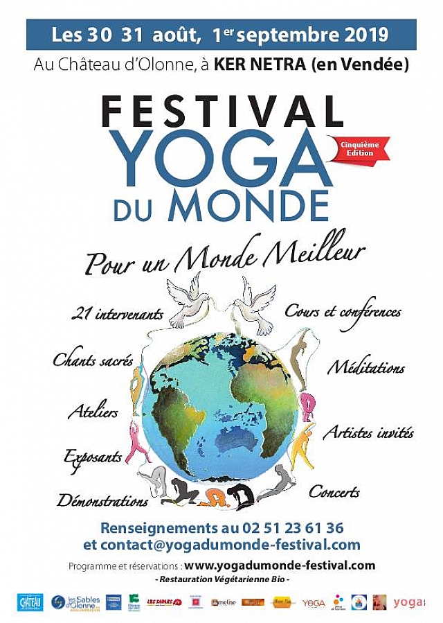 Cinquième Édition du Festival Yoga du Monde Pour un Monde Meilleur Du 30 août au 1er septembre 2019 au Château d’Olonne, Sables d'Olonne Agglomération (85100) Le Bien-Être, la Relaxation, la Méditation sont dans l’air du temps, et pour la cinquième fois au cœur du pays des Olonnes, le pays qui se situe au-dessus de l’eau, le Festival Yoga Du Monde organisé par l’Association Yoga du Monde prendra ses quartiers dans la ville du Château d’Olonne - Sables d’Olonne agglomération, en Vendée, au Centre de vacances « KER NETRA » les 30 - 31 août et 1er septembre 2019. Pourquoi ce festival ? L’opportunité nous est offerte de promouvoir et partager les expériences de l’essence du Yoga, au-delà des styles, au-delà des fédérations, à travers les différentes techniques proposées par les professeurs présents, afin de nous permettre de revenir à la source de ce que nous sommes vraiment. Partager l'amour du yoga et en découvrir les nombreuses facettes, dans la plus grande convivialité. Chacun, chacune y trouvera son compte et ce, quels que soient son cheminement, sa religion ou ses croyances.