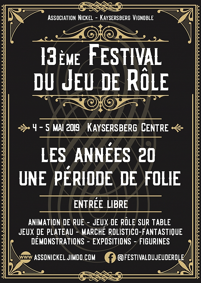 Le festival du Jeu de RĂ´le aura lieu les 4 et 5 mai 2019 dans le centre-ville de Kaysersberg (Alsace) et aura pour thème "Les annĂ©es 20 : une pĂ©riode de folie".Â